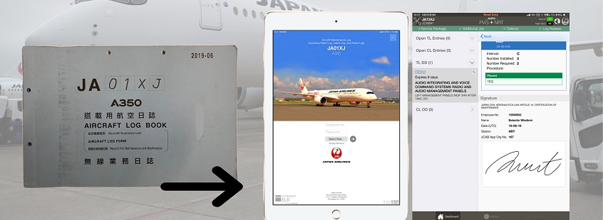 これまで運航乗務員や客室乗務員、整備士が航空機の飛行情報や不具合の修復情報を記載する、搭載用航空日誌(フライトログ)、キャビンログは紙である必要がありました。これらを電子的に記録・保管するシステムを導入するために、整備士自らが運航/客室乗務員とシステム開発について検討、国土交通省と関連法制変更の調整を行い、日本で初めてフライトログおよびキャビンログ電子化の認可をいただきました。2019年8月よりエアバスA350型機において利用を開始し、さらに2020年6月からはボーイング737型機にも利用を拡大しております。